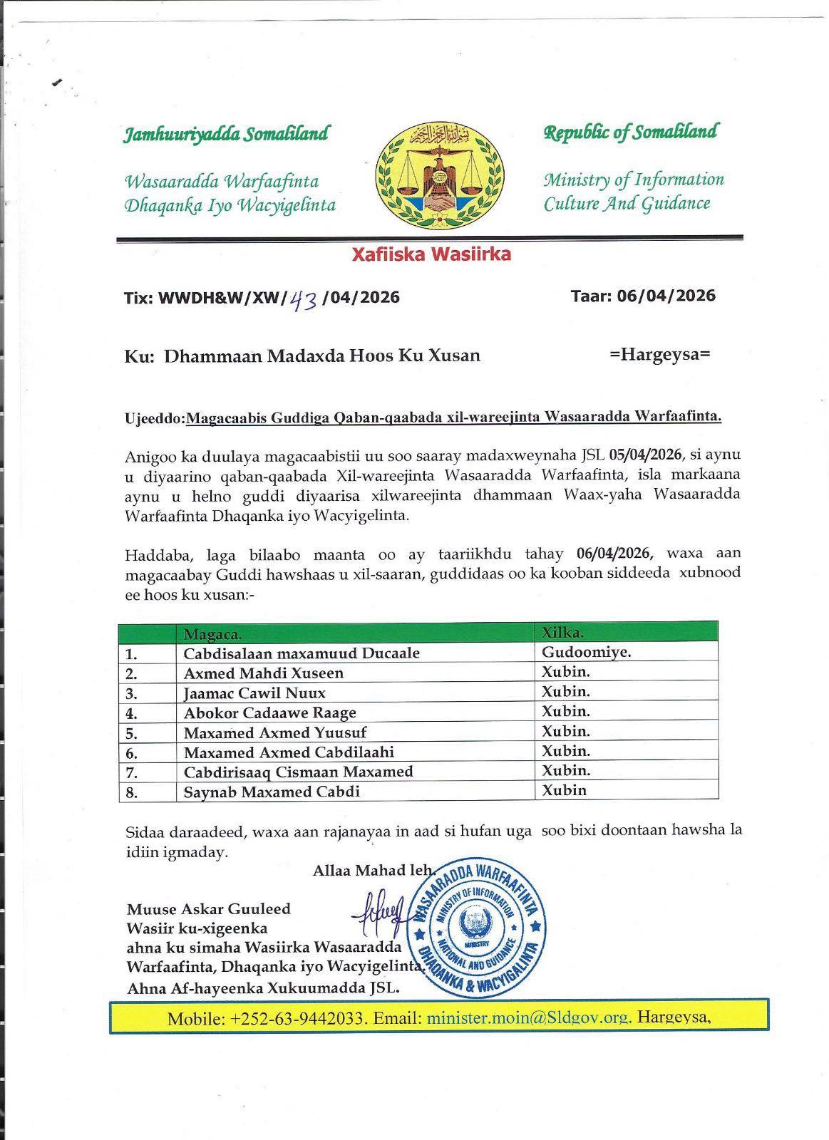 Wasaaradda Warfaafinta JSL oo magacawday guddi qabanqaabiya xil-wareejinta wasiirka cusub